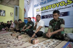 “Saya perwakilan dari Kodim 1003 HSS menyambut baik dan memberikan apresiasi yang setinggi-tingginya kepada Bapak Haji Kartoyo yang telah menyelenggarakan sosialisasi ideologi Pancasila. Ini merupakan kegiatan yang sangat positif dan sangat bagus,” ucapnya.
