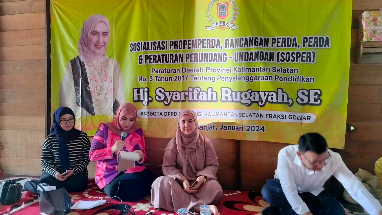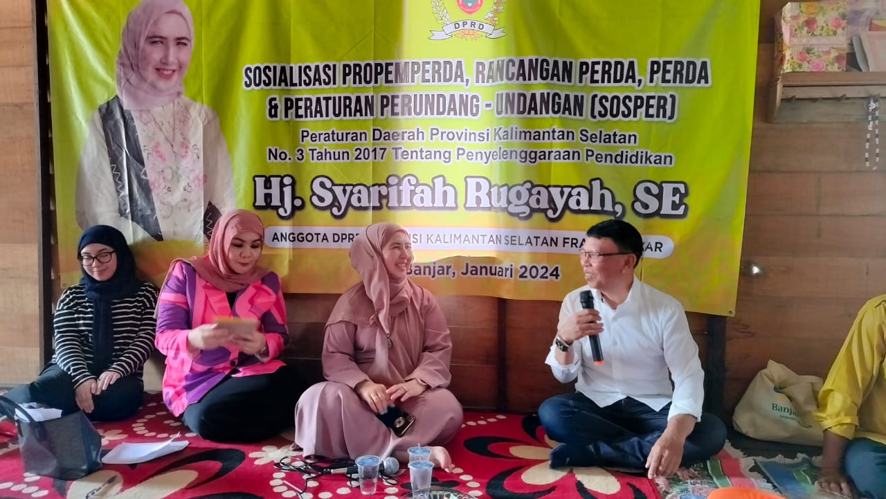 Hal ini yang menjadi kekhawatiran Anggota DPRD Provinsi kalsel, Hj. Syarifah Rugayah. Pada kegiatan Sosialisasi Propemperda, Rancangan Perda, Perda & Peraturan Perundang-undangan (Sosper) di Desa Sungai Tabuk Keramat, Kecamatan Sungai Tabuk, Kabupaten Banjar, Sabtu (6/1), Hj. Syarifah Rugayah menyampaikan bahwa pendidikan karakter berbasis kearifan lokal merupakan salah satu solusi untuk menghadapi isu-isu strategis terkini di era digital.