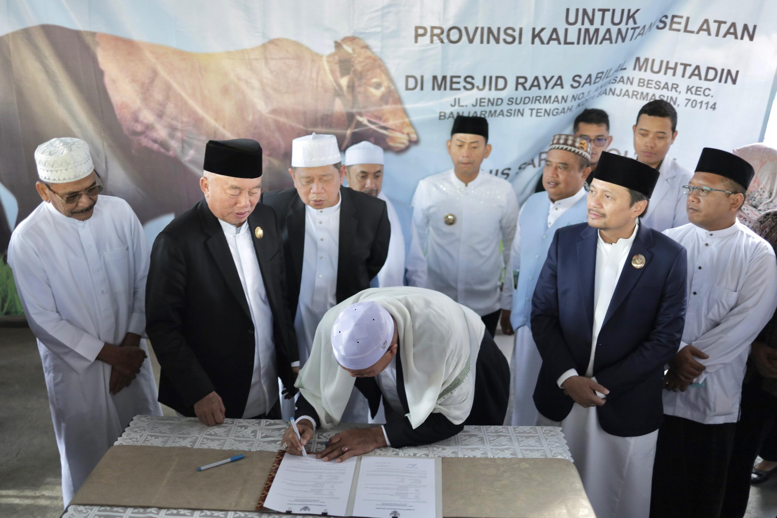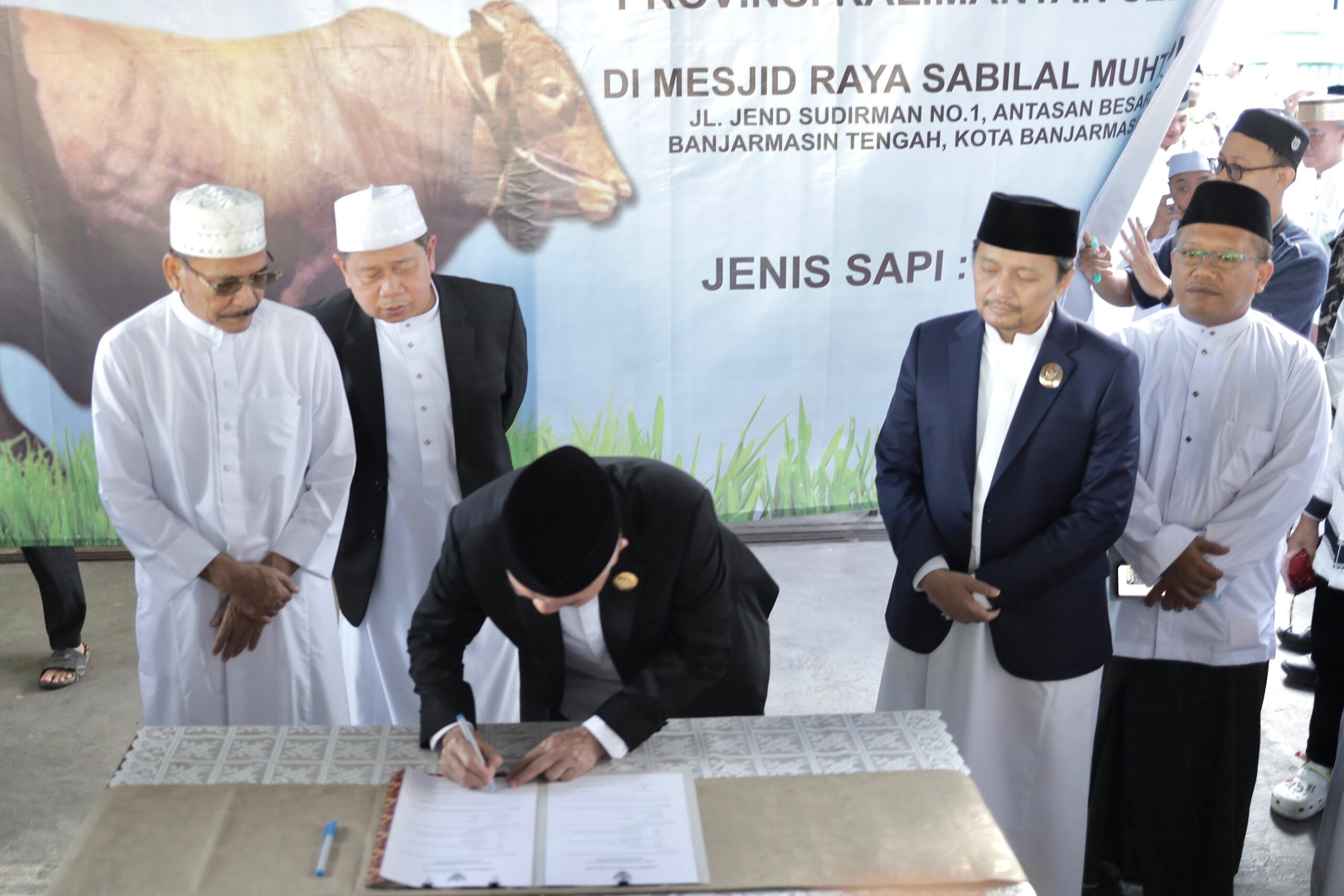 Satu ekor sapi Limousin dengan berat kurang lebih 1.100 Kg diserahkan langsung oleh Gubernur Kalsel kepada Wakil Ketua Badan Pengelolal Mesjid Raya Sabilal Muhtadin H.M Fadlian Noor.