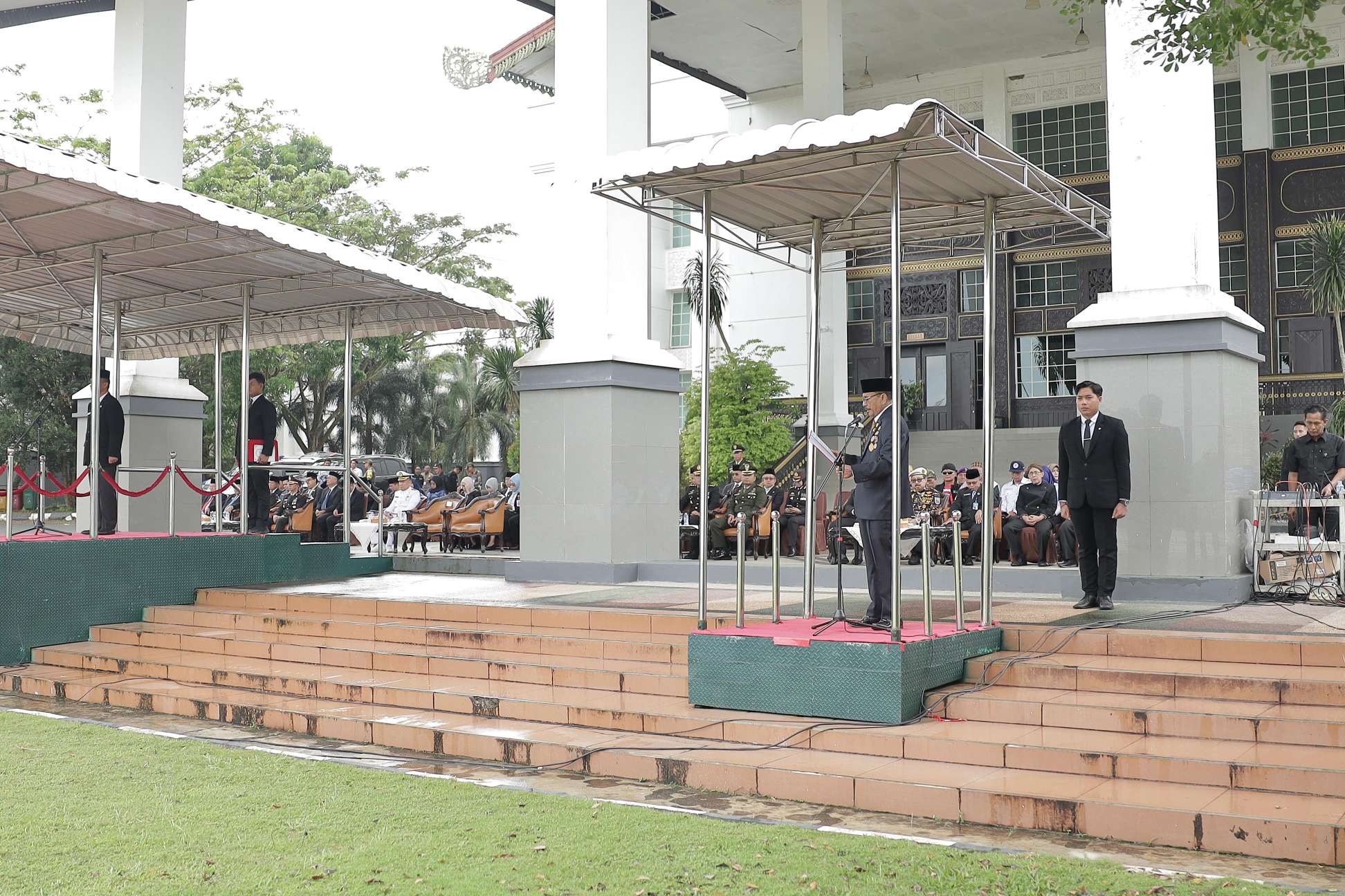 Bertempat di Halaman Kantor Gubernur Kalsel Banjarbaru, upacara Peringatan Hari Hari Lahir Pancasila 2025 yang mengusung tema “Memperkokoh Ideologi Pancasila Menuju Indonesia Raya” ini dipimpin oleh Staf Ahli Gubernur Bidang Pemerintahan Hukum dan Politik, Adi Santoso S. Sos., M.Si.